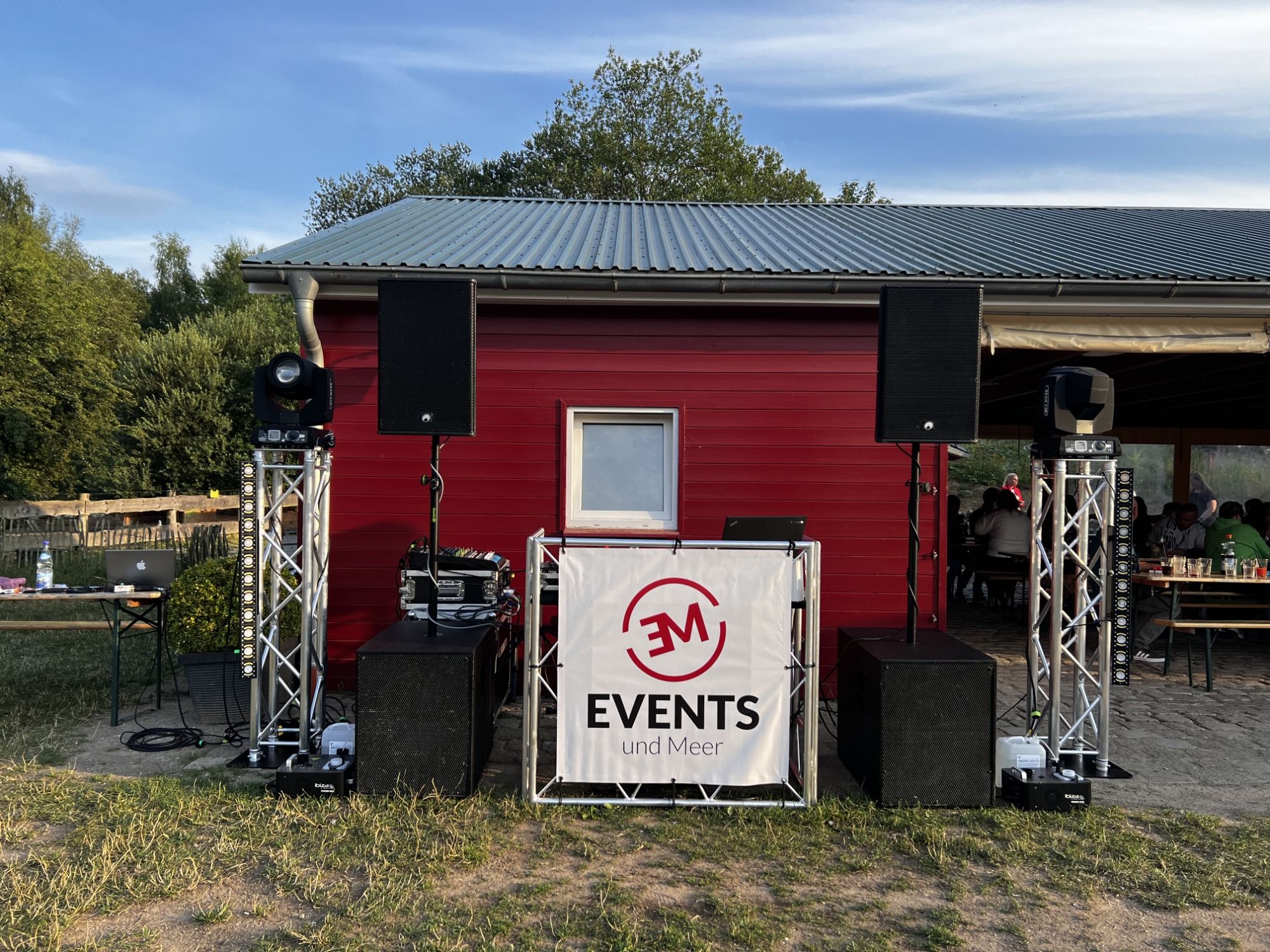Folgende Technik wurde verbaut: Ton: 2x B&C Sub18 2x HK PR112 Licht: 2x PURElight FX Mini Derby 2 auf Truss Tower DIY LED Wand